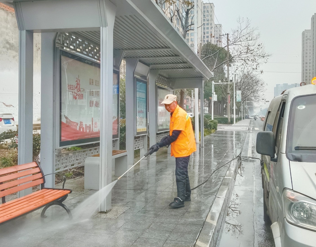 图为环卫工人对公交车站进行保洁。