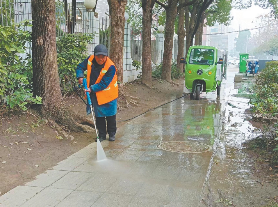 近年来,市环卫局推行“机械作业+人工保洁”模式,采取“冲、洗、扫”一体化方式对路面进行深度清洁。图为3月11日,保洁工人对城市道路进行精细化保洁。摄影记者黄芸通讯员 胡亮